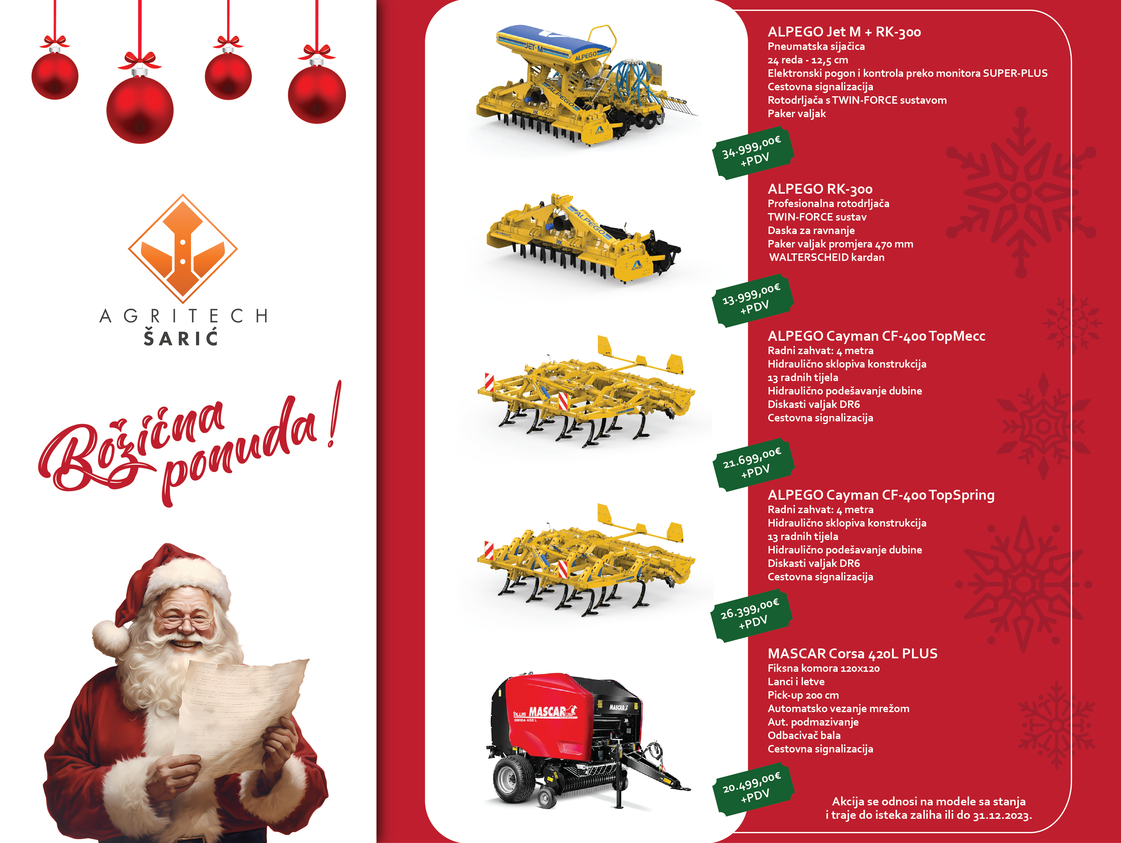 Ne propustite velike božićne popuste u Agritech Šarić! Istražite bogatu božićnu ponudu Alpego, Caffini, Mascar i OPaLL-AGRI strojeva sa stanja po fantastičnim cijenama. Uz popuste na Caffini strojeve darujemo i traktorsku navigaciju AvMap Farmnavigator Količine su ograničene te akcija traje do isteka zaliha ili do 31.12.2023. Zato požurite i iskoristite ovu božićnu ponudu. Za više […]